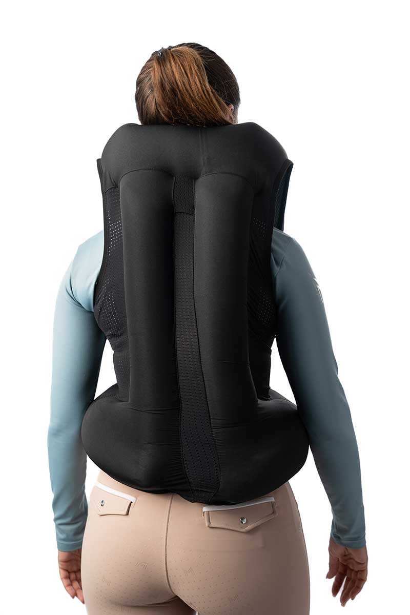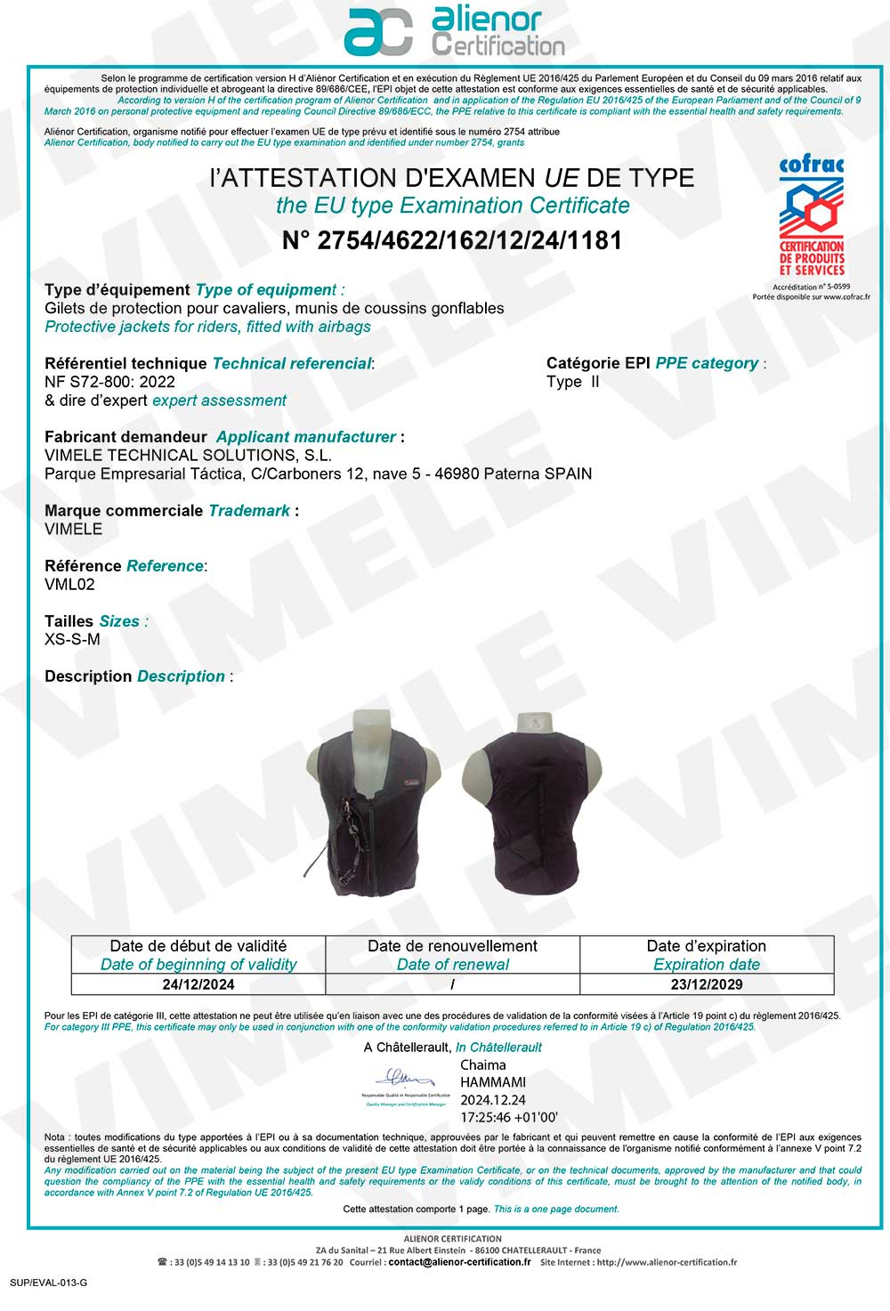 Specificamente progettato per l'equitazione, disponibile in 5 taglie (XXS, XS, S, M e L). Omologato da ALIENOR secondo la norma NF S72-800:2022, essendo Vimele l'unico marchio spagnolo con questo livello di protezione e uno dei pochi marchi a livello internazionale che offre l'omologazione in 2 diversi giubbotti airbag.