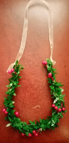 Ferro di cavallo natalizio tipo ghirlanda con palline dorate e filo di cristalli rossi.