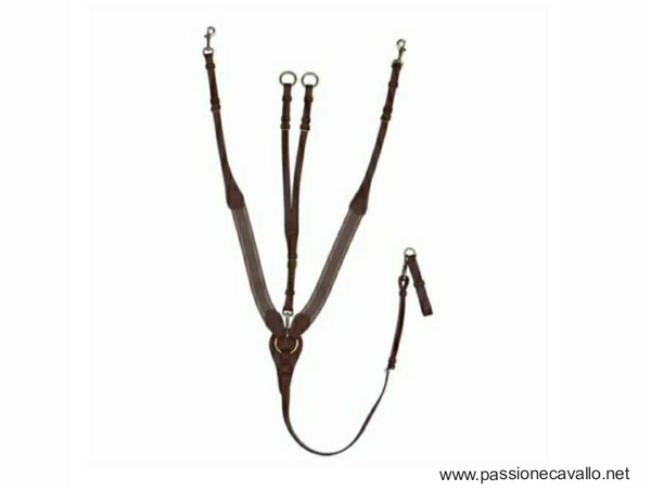 Pettorale a Y con cinturini elastici lunghi in cuoio di ottima qualità, con martingala regolabile e fibbieria in ottone dorato.