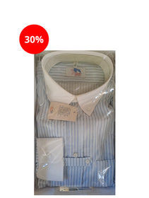 Elegante camicia sciancrata a maniche lunghe, realizzata in pregiato cotone elasticizzato spigato. Rifinita da eleganti profili in satin colore argento lungo i tagli laterali e da ricamo lurex a treccia con morso sul polsino. Personalizzata con ricamo 'Tattini' in argento lurex. Taglia XS e S. Colore celeste.
