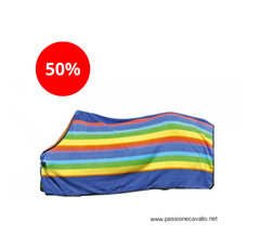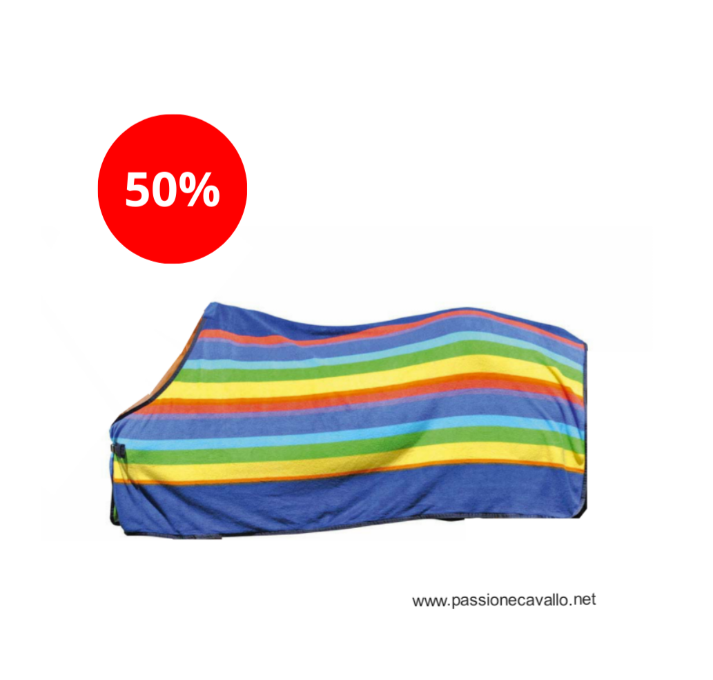 Coperta in pile -Rainbow: misura 105 cm. Traspirante, altamente termoisolante, ottimo assorbimento del sudore. 100% poliestere, tessuto a maglia di alta qualità, pile su entrambi i lati, extra morbido. Sottocoda, imbottitura antifiaccatura sul garrese, spighetta inserita, parti laterali extra lunghe, taglio extra alto.