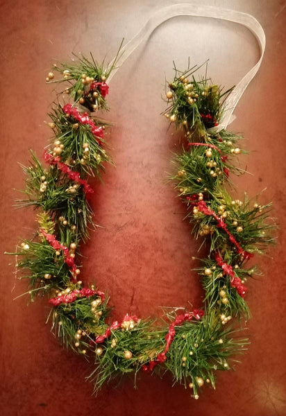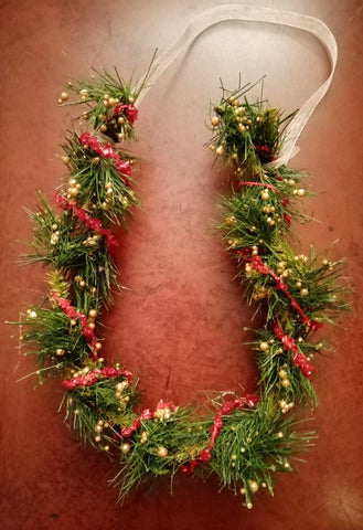 Ferro di cavallo natalizio tipo ghirlanda con palline dorate e filo di cristalli rossi.
