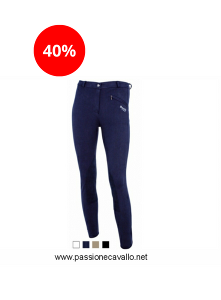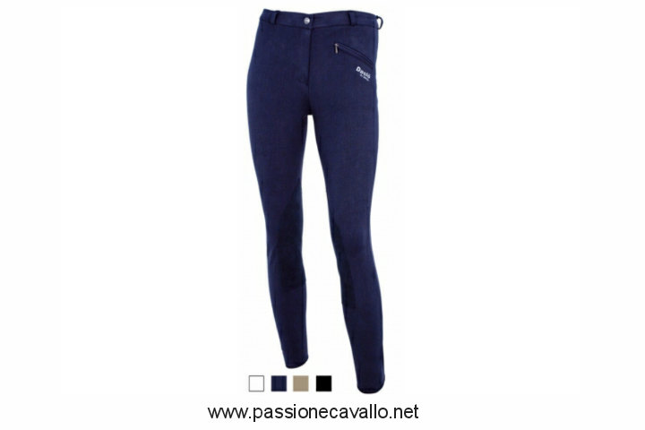Pantalone donna Daslo Gold Atena, in cotone bi-elastico 94% e 6% spandex, 430 gr, con toppe al ginocchio rinforzate in materiale scamosciato. Linea aderente con tasca anteriore zippata e logo 'Daslö' stampato a contrasto. Disponibile bianco.