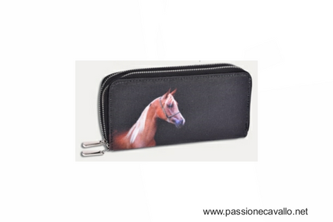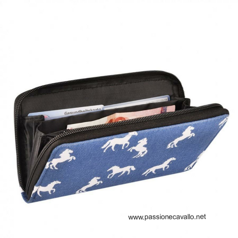 Portafoglio blu con cavallini bianchi.
