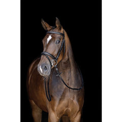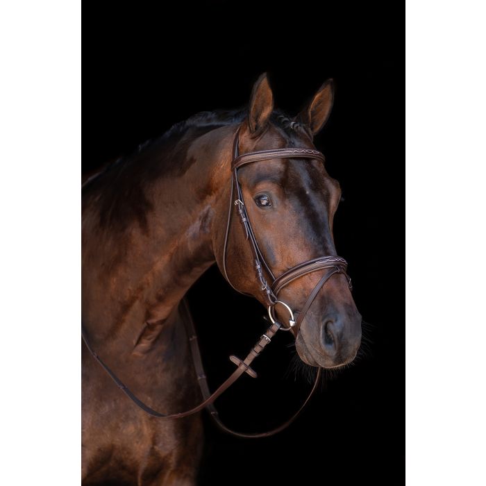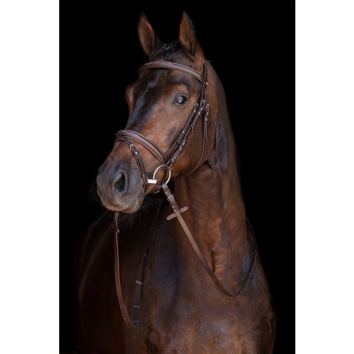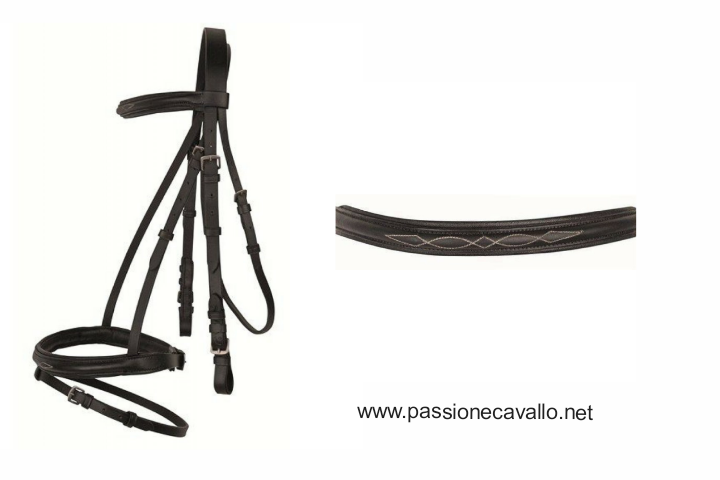 Testiera - Jana: cuoio di qualità, guarnizioni opache, colore argento. Capezza inglese, nasalina e frontalino con imbottitura morbida, redini con antiscivolo in tessuto.